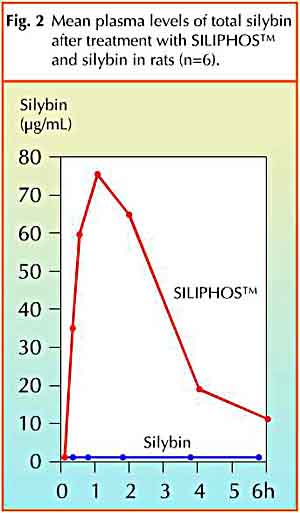 In rats, after oral administration of 200 mg/kg of silybin, the plasma levels of this drug and its conjugated metabolites were below the analytical detection limit, while, after oral administration of Siliphos® (200 mg/kg as silybin) the plasma levels of silybin (free and total) were easily measurable (Fig. 2).