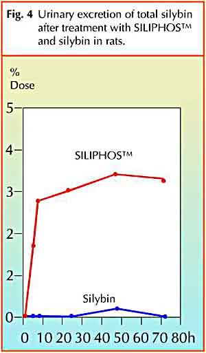 In fact, the urinary excretion after administration of uncomplexed silybin was just 0.032% of the administered dose, whereas it was 3.7% for Siliphos.