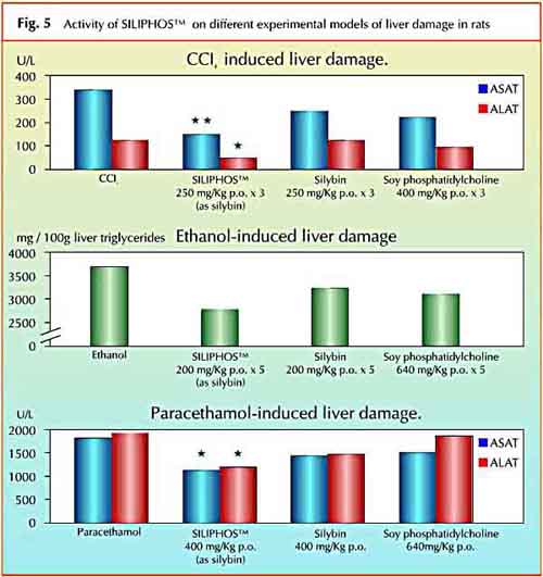 The results, including the optimal tolerability obtained in these "extreme" clinical situations, give strong support for the use of Siliphos® in those "non pathological" conditions mostly associated with the action of damaging agents on liver cells. Vailati et al.18 performed an open randomized trial on 65 patients suffering from chronic persistent hepatitis. The protective effects of Siliphos® increased with the dose and 240 mg/die p.o. (as silybin) resulted to be the mean therapeutic dose whereas 360 mg/die p.o. (as silybin) was recommended for the treatment of the severe resistant form of hepatitis or during the initial management of the patients.