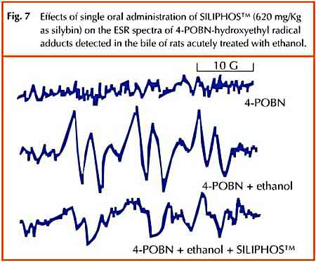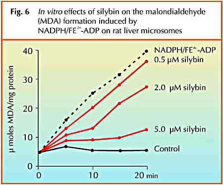 Siliphos® allows silybin to reach the target organ, the liver, in concentrations which are reported to be effective in several models of liver intoxication11,12 (Fig. 5) and to fit with the most important molecular mechanisms observed in vitro, such as the antioxidant13-16 (Fig.6, Fig.7) and the stimulation of protein synthesis in hepatocytes17 (Fig.8).