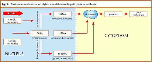 This graph shows the mechanism by which silybin has been clinically shown to stimulate protein synthesis in liver cells. This process leads to the regeneration of healthy liver cells.