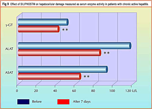 In a study carried out on 232 patients with alcoholic, acute viral or iatrogen hepatitis, the subjects have been treated with 240 or 360 mg/die p.o. (as silybin) for 120 days. No side effects have been observed and Siliphos®, in comparison with placebo, showed its ability to improve liver condition.19 In a short-term pilot study performed on 20 patients with chronic active hepatitis, the biochemical parameters related to hepatocellular damage and necrosis were significantly reduced after 7 days of treatment with 240 mg/die p.o. (as silybin) 20 (Fig. 9). Finally, a 2-month study on 8 patients complaining of chronic active hepatitis has shown the ability of Siliphos® to reduce serum MDA concentration and to increase galactose elimination by the liver.21